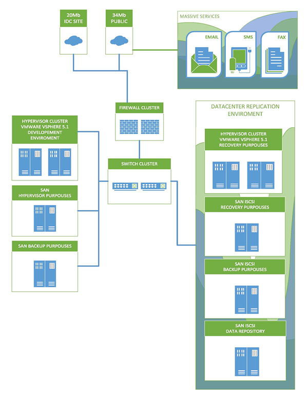 Gli stessi sono collegati in rete attraverso un'infrastruttura ridondata, in grado di offrire le migliori performance assieme alla garanzia di continuità di servizio ed elevato standard di qualità. In particolare hanno ridondanza di alimentazione e Livello di sicurezza RAID (RAID 1) e dispongono di una banda garantita al 99,98% del tempo, su base annua .La Web Farm è immersa nella rete d'interconnessione attraverso interfacce con quattro reti internet di livello internazionale.